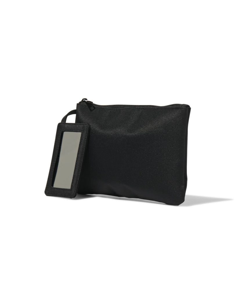 HEMA HEMA Make-up Tas Plat Zwart 14×21 nu voor slechts €3.99,-. Met dit make-up tasje houd je al je spullen helder en overzichtelijk bij elkaar. Door het kleine formaat heb je hem altijd bij de hand en is hij ideaal voor onderweg. Binnenin zit een uitneembare spiegel, zo bepaal je zelf waar je die bewaard. Het tasje is gemaakt van afneembaar materiaal, zodat je een vlekje makkelijk weg haalt. De producteigenschappen: merk: HEMA. lengte in cm: 14. breedte in cm: 21. type sluiting: ritssluiting, . artikel nummer: 11890610. https://www.hema.nl/dw/image/v2/BBRK_PRD/on/demandware.static/-/Sites-HEMA-master-catalog/default/dw03f991bc/product/11890610_01_010.jpg?sw=1100&sh=1500&sm=fit&sfrm=png&bgcolor=FFFFFF.