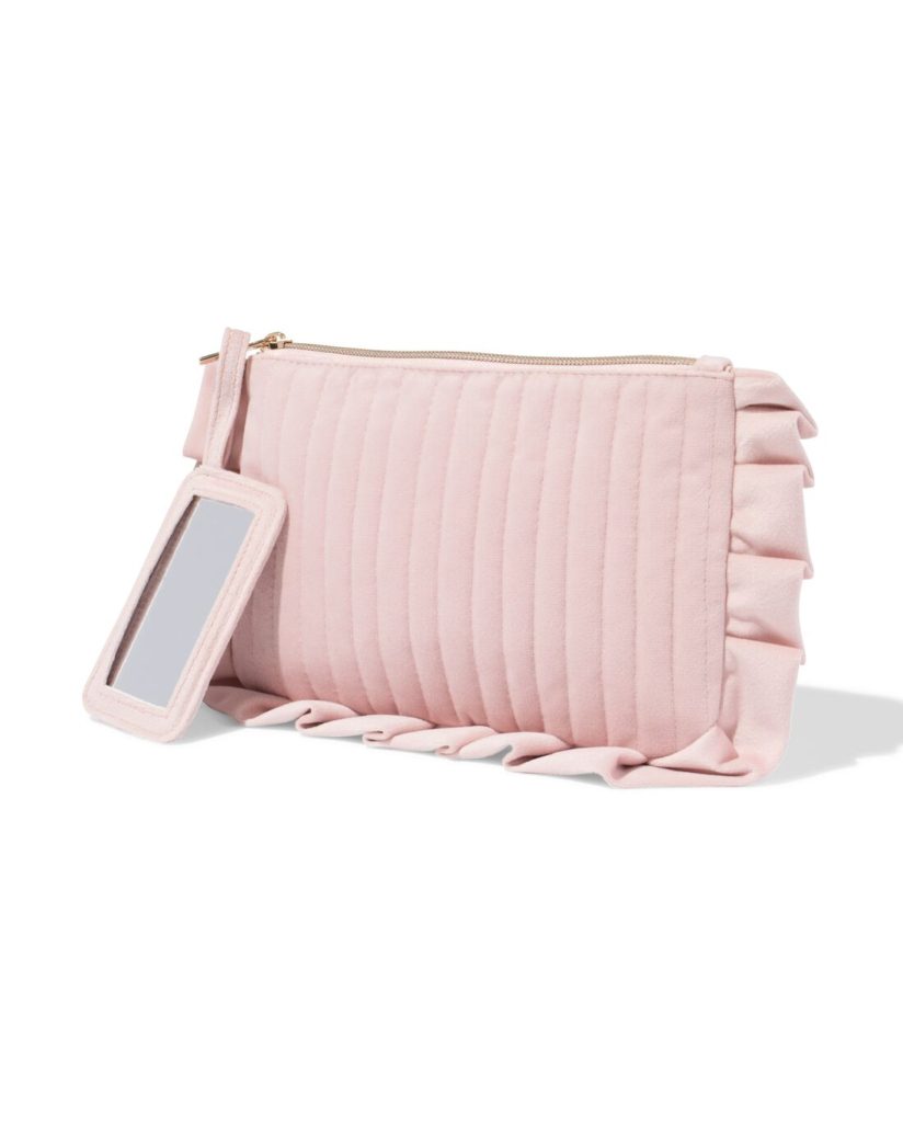 HEMA HEMA Make-up Tas 21x14cm Velours Roze nu voor slechts €4.49,-. Deze make-uptas is gemaakt van zacht roze velours en heeft opvallende ruches langs de randen. De tas sluit met een rits. Zo heb je je beautyspullen altijd overzichtelijk bij de hand, thuis of onderweg. En met het spiegeltje kun je overal je make-up checken en bijwerken. De producteigenschappen: merk: HEMA. lengte in cm: 14. breedte in cm: 21. artikel nummer: 11890721. https://www.hema.nl/dw/image/v2/BBRK_PRD/on/demandware.static/-/Sites-HEMA-master-catalog/default/dw7aaa7c6f/product/11890721_01_004.jpg?sw=1100&sh=1500&sm=fit&sfrm=png&bgcolor=FFFFFF.