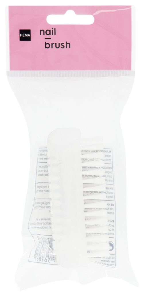 HEMA HEMA Nagelborstel nu voor slechts €1.99,-. Gebruik een nagelborstel voor het makkelijk en grondig reinigen van de nagels van je handen en voeten. Deze borstel heeft extra harde nylonharen voor een langere levensduur. Handig voor in de keuken, badkamer, tuin en/of camping. . De producteigenschappen: lengte in cm: 8.5. breedte in cm: 3.5. hoogte in cm: 3.5. artikel nummer: 11912015. 11912015.