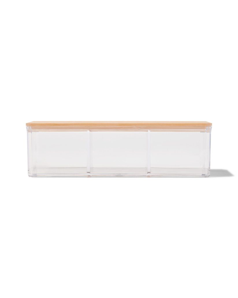 Ga voor overzicht en een opgeruimde (bad)kamer door deze transparante organizer met bamboe deksel. In de organizer zitten 3 vakjes waar je je spullen in kunt verdelen. Door de 3 verschillende vakken kun je je spullen goed verdelen. Je kunt hem neerzetten in de badkamer voor make-up en crèmes, maar bijvoorbeeld ook op je bureau met tape of paperclips. Je kunt hem goed combineren met de dubbele organizer om de set uit te breiden (artikelnummer: 80330011). De producteigenschappen: aantal vakken: 3. lengte in cm: 9. breedte in cm: 12.5. artikel nummer: 80330010 Unisex.